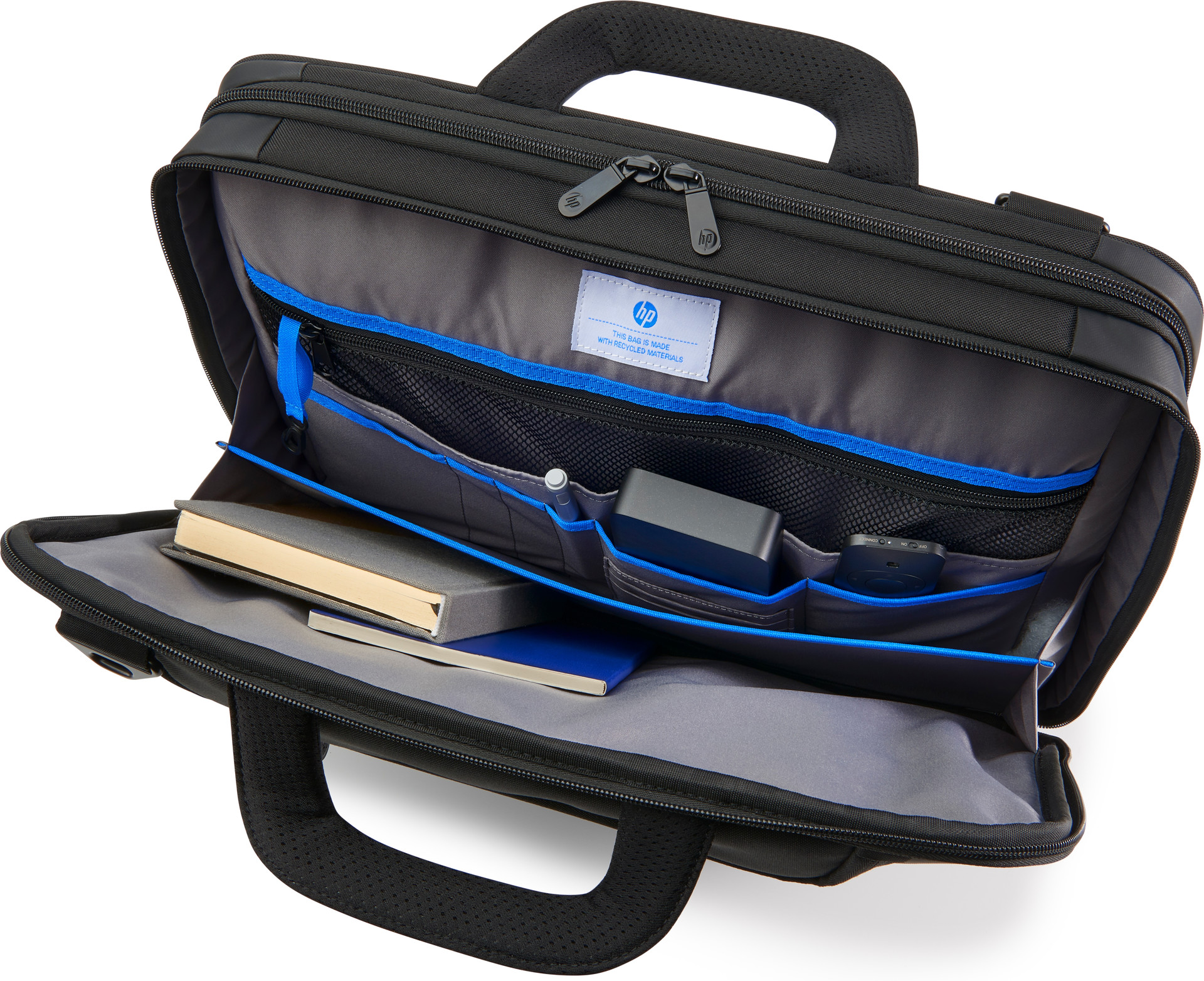 HP Recycled. Tipo de caso: Toploader bag, Tamanho máximo de ecrã compatível: 39,6 cm (15.6"). Peso do produto: 1,22 kg. Coloração de superfície: Monótono, Cor da caixa: Preto